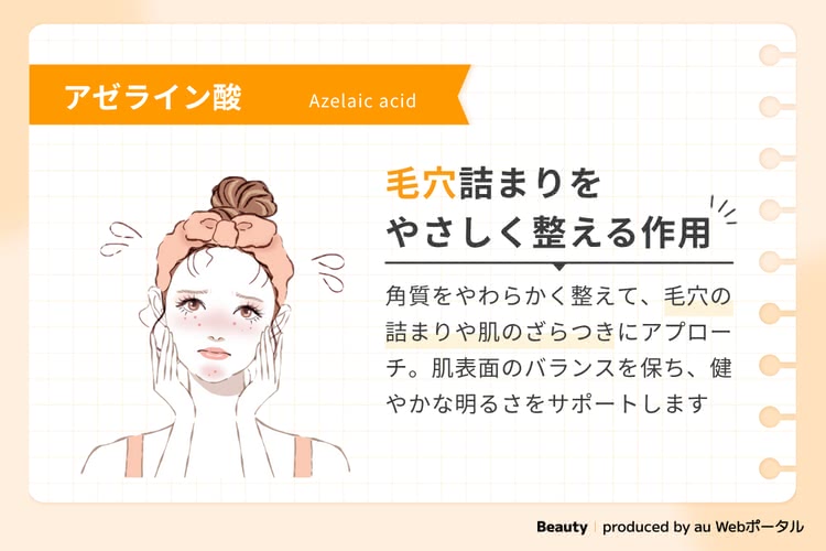 アゼライン酸は、肌のざらつきや毛穴詰まりを穏やかに整える頼もしいサポート成分です。