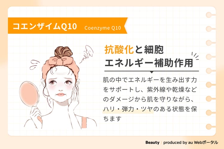 コエンザイムQ10は、肌の「元気」を支える成分。ハリ・ツヤを保ち、年齢を感じにくい肌を目指すサポートをしてくれます。