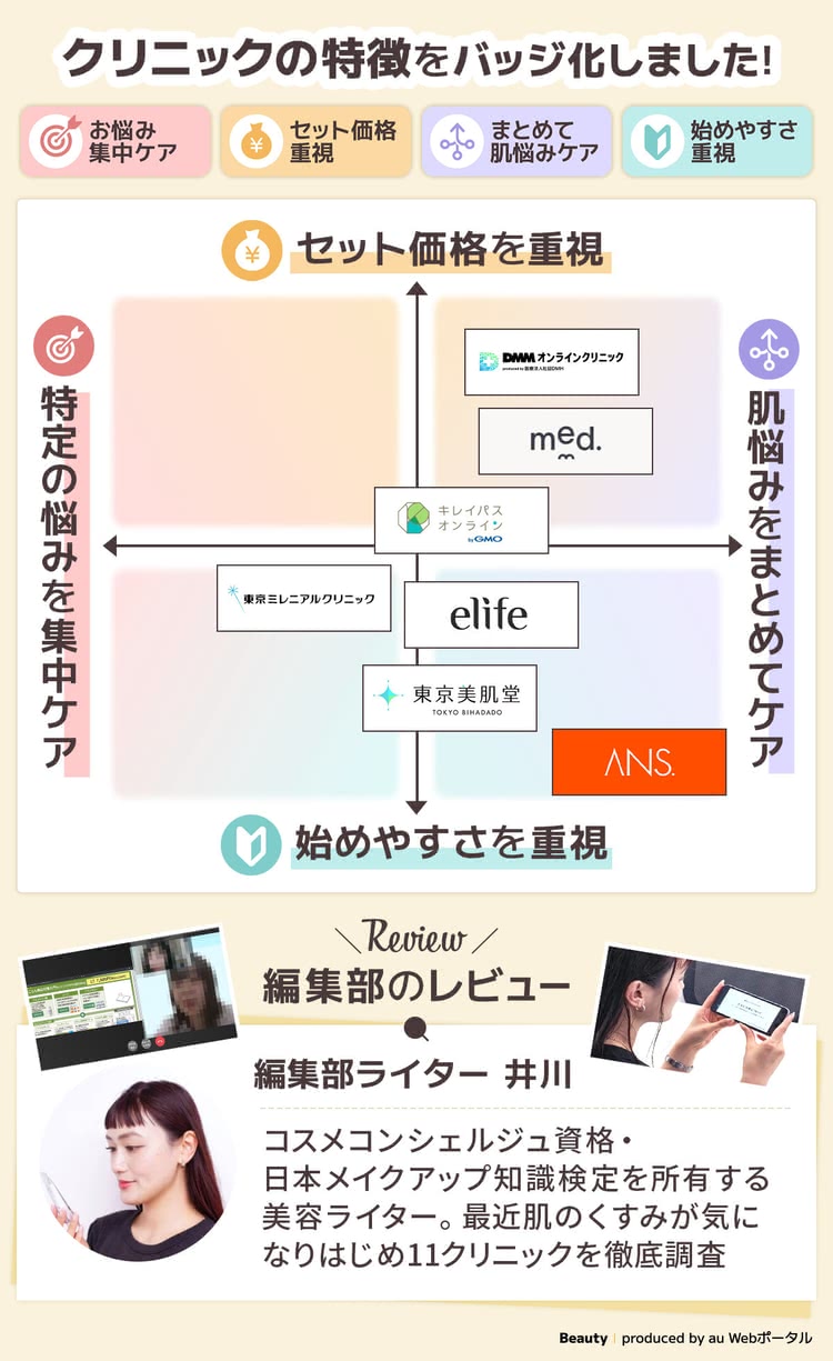 | DMMオンラインクリニック | ANS. | 東京美肌堂 | med. | キレイパスオンライン | elife | 東京ミレニアルクリニック | |
