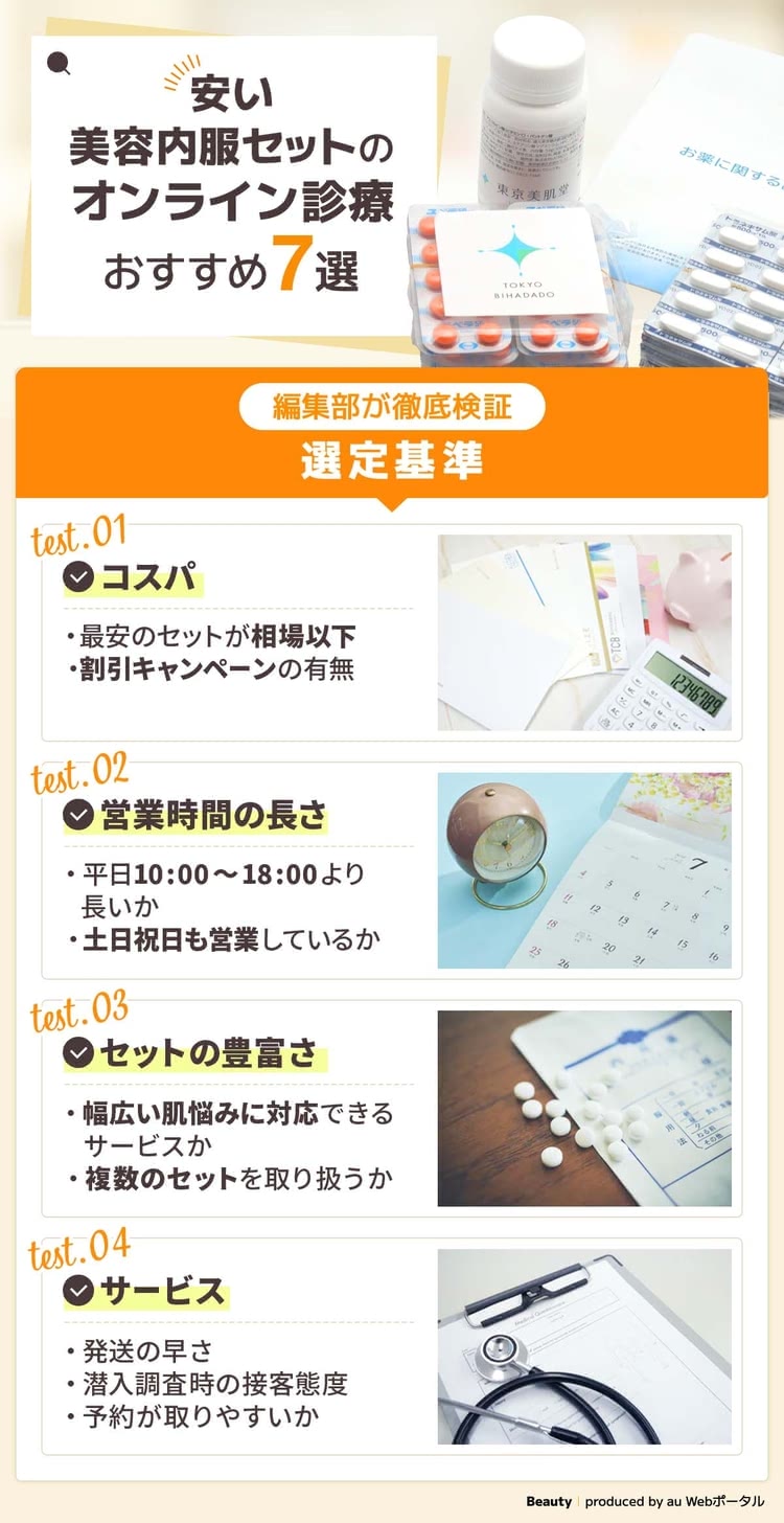 そこで今回は、次の基準で選定した美容内服セットが安いおすすめのオンライン診療を紹介します。